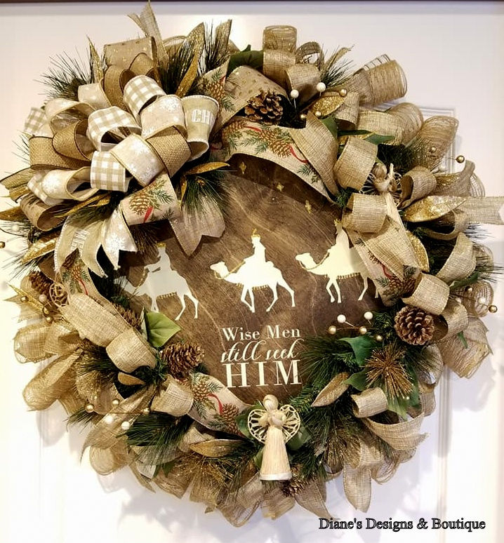 Many of you know Christmas is my favorite time of year. I love it all! The message of the season, family gatherings, baking with my children, and quiet nights by the fire place with my grand kids. So of course there is a plethora of inspiration! But I wanted my wreaths to be set apart. Don't get me wrong, I love traditional wreaths with the red and gold, or a snowy look, yet I wanted something more. We had just gotten a large order from Chalk Couture which at that point I was still just doing it as a hobby. Alex and I were giddy like it was Christmas morning as we opened the large white envelope. And it hit me. BAM! Right in the face. The Three Wise Men transfer. It was perfect. 3 men riding decorated camels with the words "Wise men still seek him." It was perfect! Traditional yet fresh, ornate yet simple. It was all down hill from there. I saw it with burlap, warm browns and golds, and a custard color that popped without being glaring. It to this day is probably my all time favorite. But some wreaths take a little longer to get that inspiration just right.